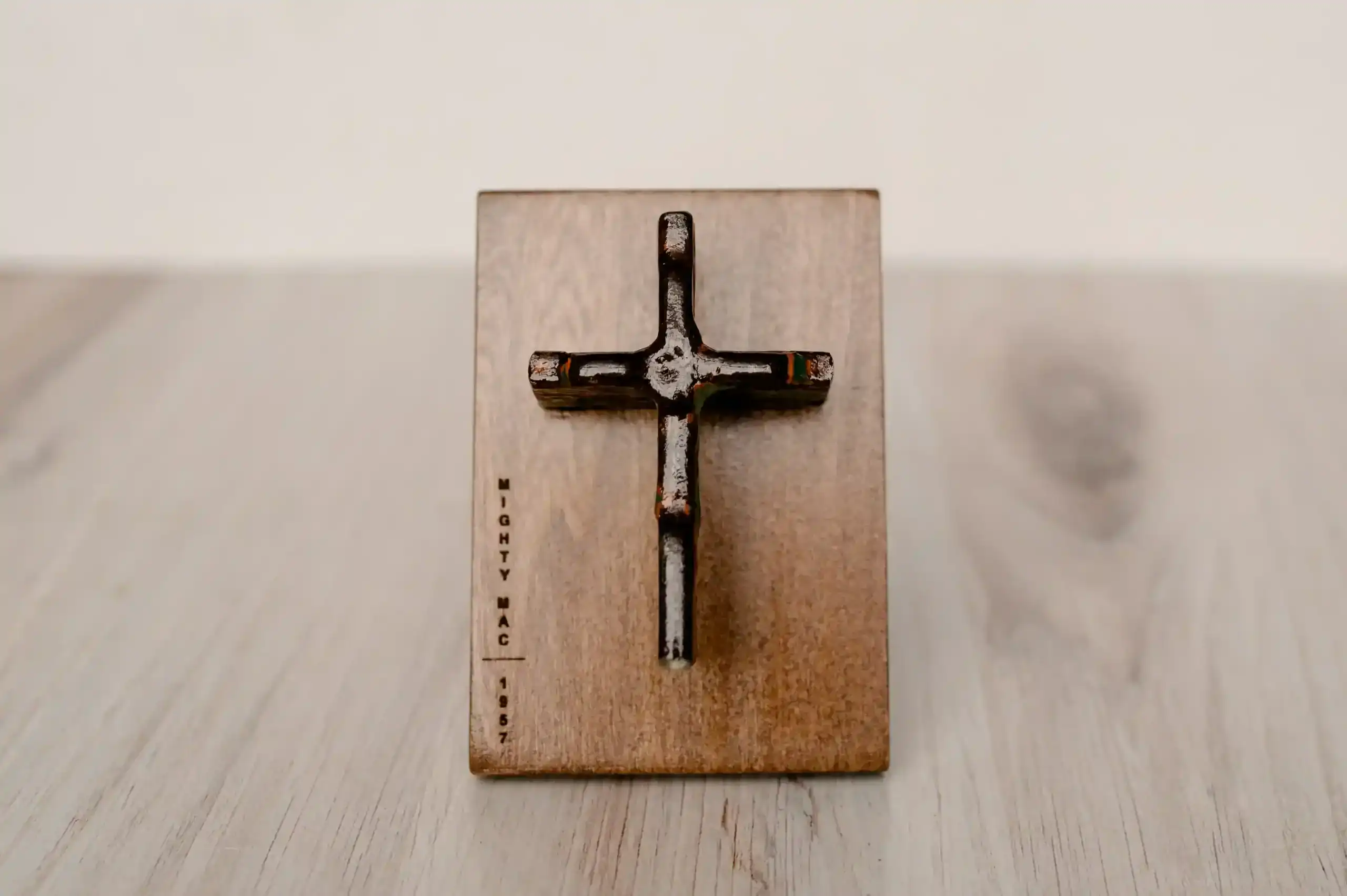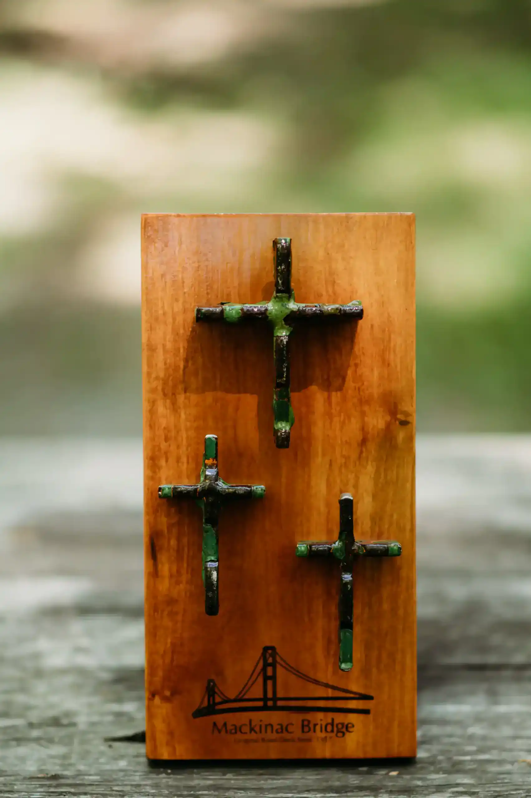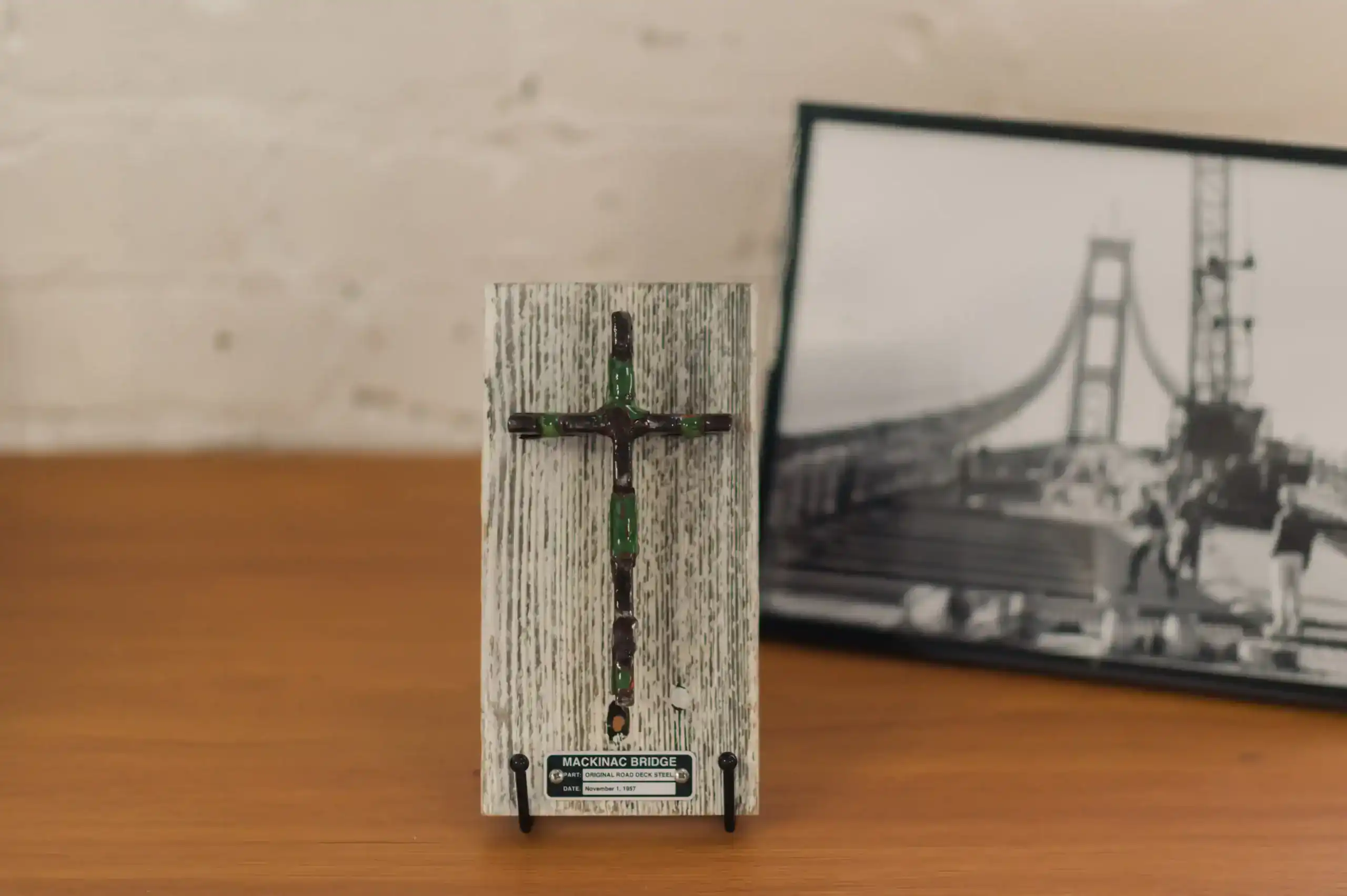 The Mackinac Bridge is a symbol of the Great Lakes and the Up North lifestyle. Working with retired bridge steel preserved from its construction in 1957 means each cross art carries authentic history—surface textures, rivet stories, and the patina of a hard-working structure built to last. The result is a decorative cross art that connects faith and place, making a meaningful focal point for Michigan homes and anyone who loves this region.